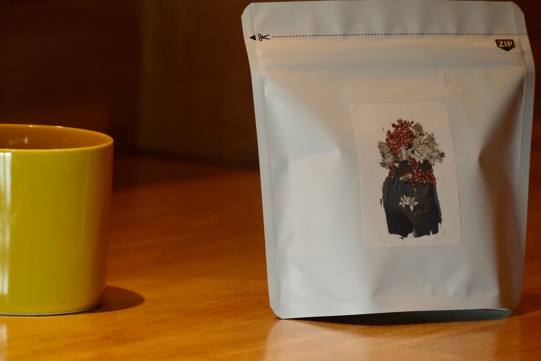 今回のイラストは時の流れを、花、実、コーヒー豆を用いて表現し、宮本さんとの出会いのきっかけとなった初個展でのメインイラストをオマージュしデザインしました。